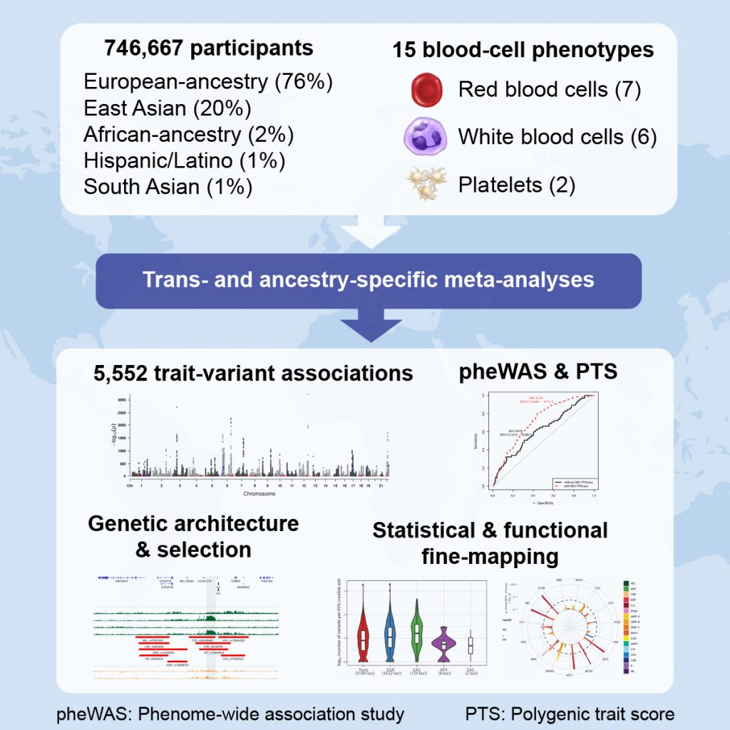 We combine our genetic analyses with genomic (e.g. expression quantitative trait loci (eQTL)) and genome editing (e.g. CRISPR/Cas9) approaches to identify genes that regulate blood-cell phenotypes. Furthermore, we are also interested in exploring whether blood-cell phenotypes can be used as predictive biomarkers of hematological and cardiovascular diseases.