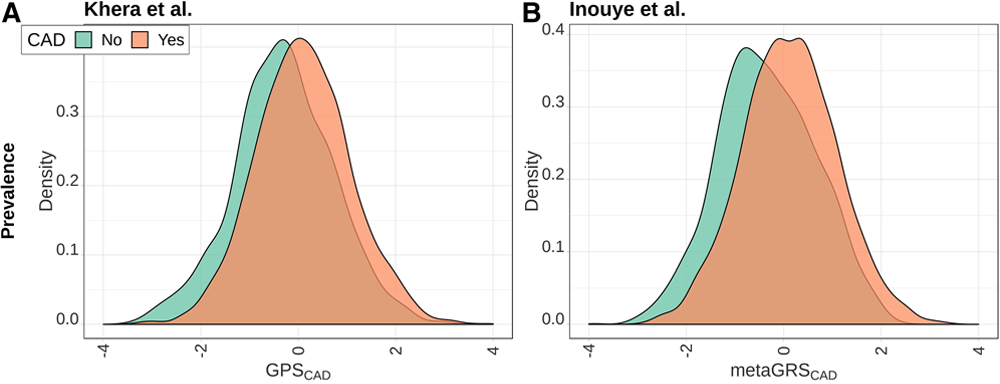 Distributions of GPSCAD and metaGRSCAD in the Montreal Heart Institute (MHI) Biobank phase 2 cohort. Distributions of the normalized polygenic risk score from Khera et al11 (GPSCAD, left column) and Inouye et al12 (metaGRSCAD, right column) in the MHI Biobank phase 2 data for prevalent (A and B), incident (C and D), and recurrent (E and F) coronary artery disease (CAD) events.