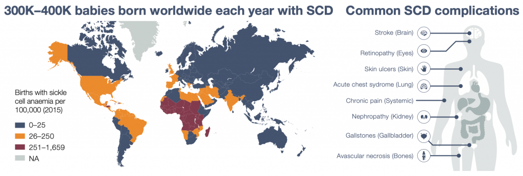 Sickle cell disease (SCD) is one of the most common monogenic diseases in the world. It is particularly prevalent in countries where malaria is endemic, as carrying one copy of the SCD mutation confers protection from malaria infection.